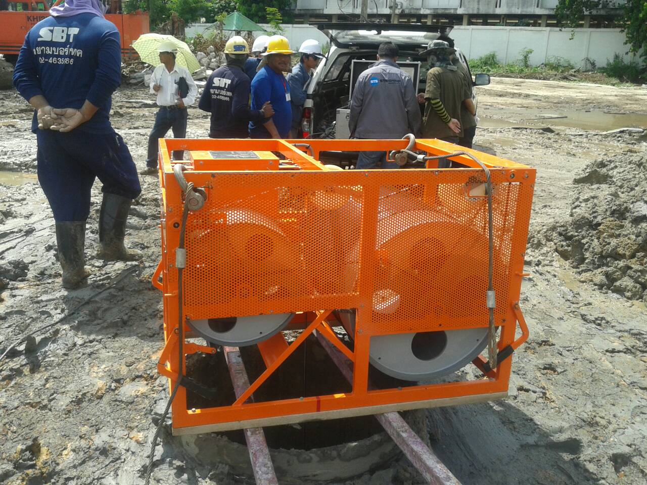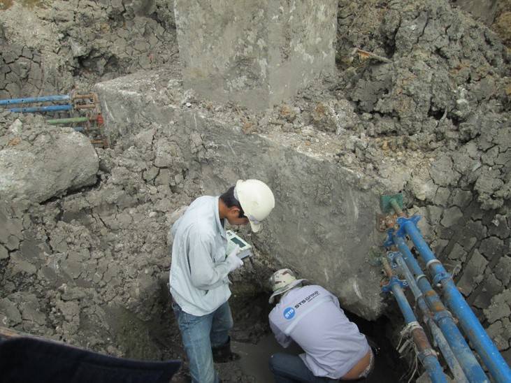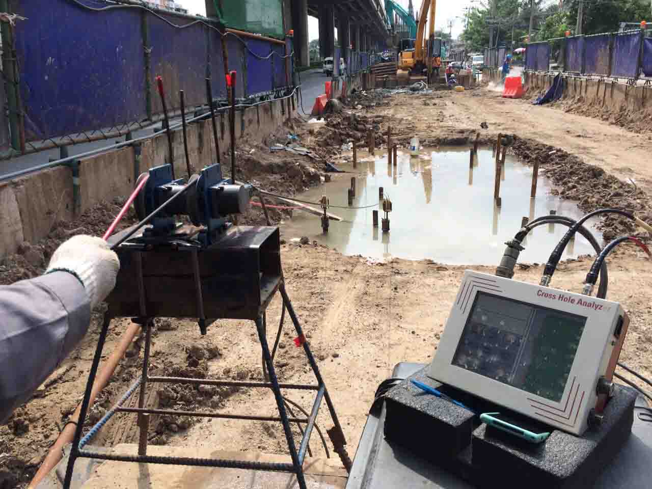 The Side Echo Test is modified method from normal sonic echo test (seismic test). The purpose of this testing is applied to evaluation the integrity condition and length of the pile foundation when foundation tops are not accessible. Due to the foundation top cannot accessible, the excavation beside the foundation pile is required until the pile side is accessible. The transfer block (steel block 500 ×500×250 mm.) shall be attached to the side of test pile by expansion bolt. This block is used to transfer the compression wave down to the pile. Before testing the tri-axial accelerometer geophone shall be attached beside the pile at approximate 0.15-0.20 cm. below the transfer block. After that the transfer block is struck by the hand held hammer on the vertical direction. The movement of the pile, caused by hammer impact stress wave and subsequent reflection is measured by the above mention sensitive accelerometer. The acceleration signal is converted to velocity and presented on screen as function of time. All result are stored for use in reports.