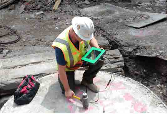 Parallel Seismic Testing system is designed to determine the length and integrity of foundations when the top is not accessible or when the pile is too long and slender to test with echo techniques, or below a buried pile cap. Ultimately, Parallel Seismic testing provides information concerning the length and compression velocity of foundations and can be used on concrete, wood, and steel foundations. In Parallel Seismic test method, the exposed top of the foundation is impacted by an impulsive hammer to generate compression waves which travel down the foundation and are refracted to the surrounding soil. The refracted wave arrival is tracked at regular intervals by a hydrophone receiver in a cased borehole. The depth of the foundation is determined by plotting the first arrival times as a function of depth and observing the depth where a change of slope occurs. For this test method, a borehole must be drilled within 1.00 to 1.50 of the foundation edge and should extend at least 5.00 to 10.00 m. deeper than the anticipated foundation depth. The borehole must be drilled as vertical as possible, cased with steel or PVC pipes, capped at the bottom; and, in the case of hydrophone receivers, be filled with water prior to testing.