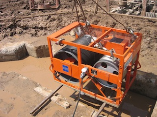 Drilling Hole Monitoring by Koden, model : DM-604, 604R and 604RR, can measure and confirm for underground foundation work, the state of wall surface, pile diameter, deflection and incline, namely the "vertical accuracy" of the drilled hole or excavated wall. The deviation of the bore hole or trench from the perpendicular and any surface cavities in the bore hole or trench wall are measured. The ultrasonic measurement probe is suspended vertically from a cable and lowered into the object to be surveyed. At the same time, orthogonal waves are continuously emitted from the device and reflected from the walls. The reflected waves are registered by measurement sensors. The distances, calculated as a function of wave speed and reflection time, are presented in graphic form.