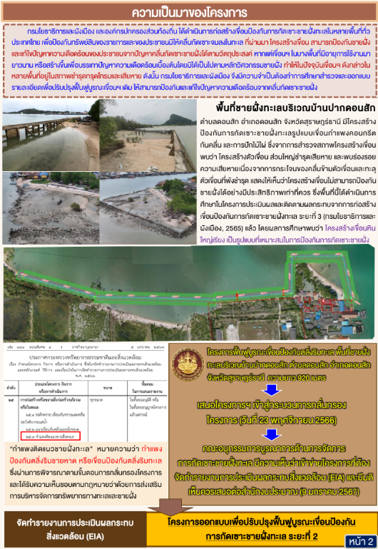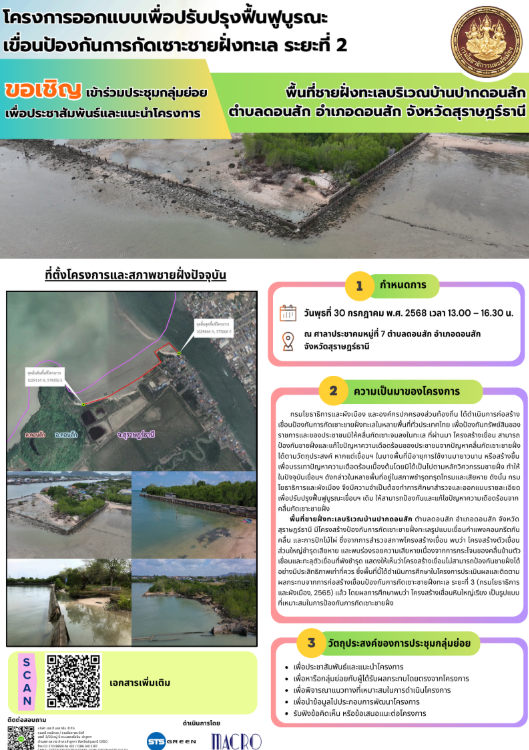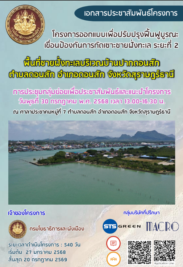 ขอเชิญเข้าร่วมประชุมกลุ่มย่อยเพื่อประชาสัมพันธ์และแนะนำโครงการงานจ้างออกแบบเพื่อปรับปรุงฟื้นฟูบูรณะเขื่อนป้องกันการกัดเซาะชายฝั่งทะเล ระยะที่ 2 พื้นที่ชายฝั่งทะเลบริเวณบ้านปากดอนสัก ตำบลดอนสัก อำเภอดอนสัก จังหวัดสุราษฎร์ธานี ในวันพุธที่ 30 กรกฎาคม พ.ศ. 2568 เวลา 13.00 – 16.30 น. ณ ศาลาประชาคมหมู่ที่ 7 ตำบลดอนสัก อำเภอดอนสัก จังหวัดสุราษฎร์ธานี