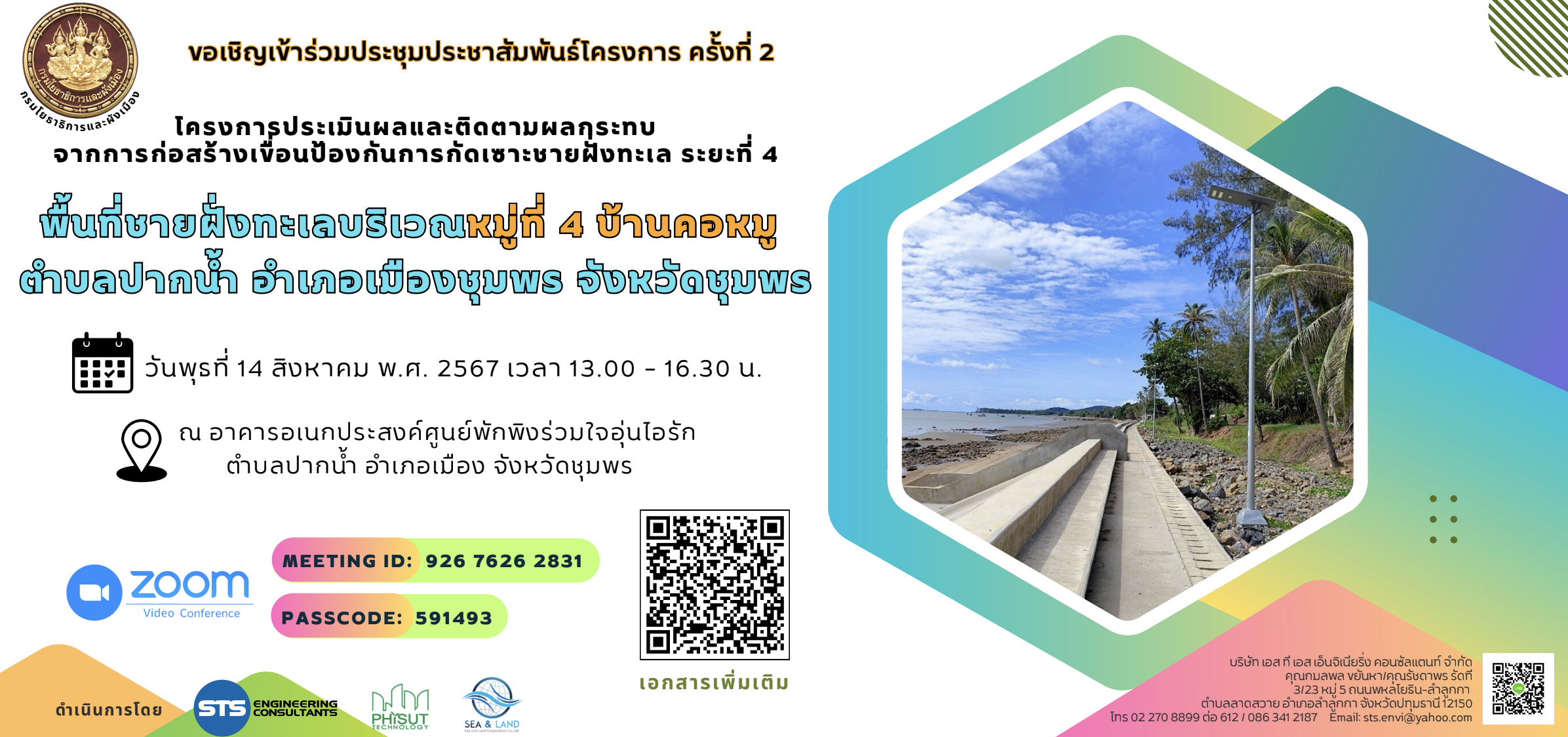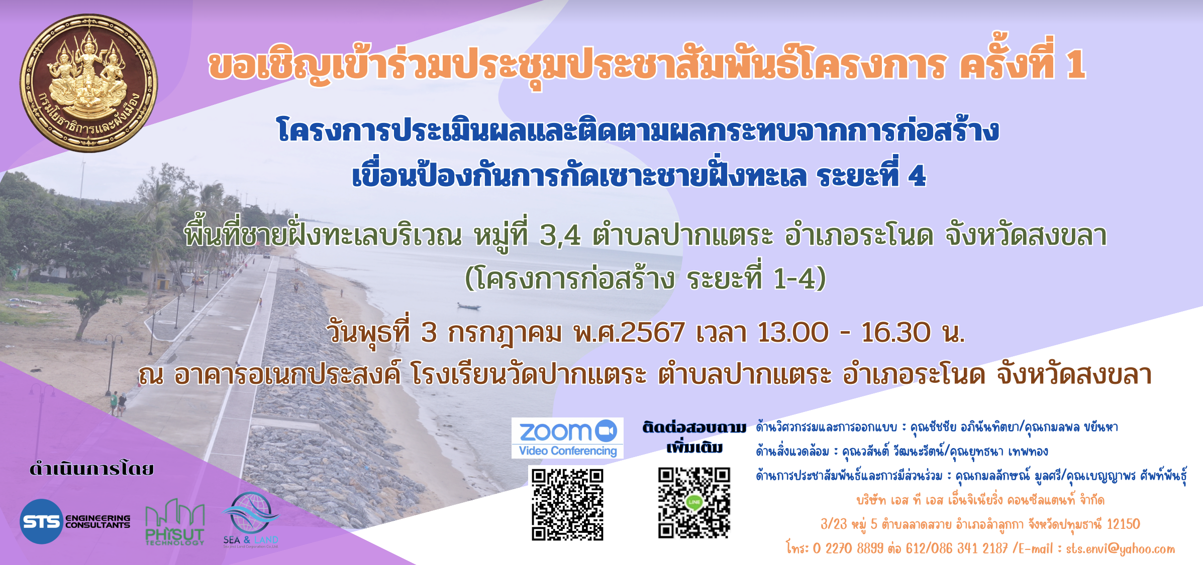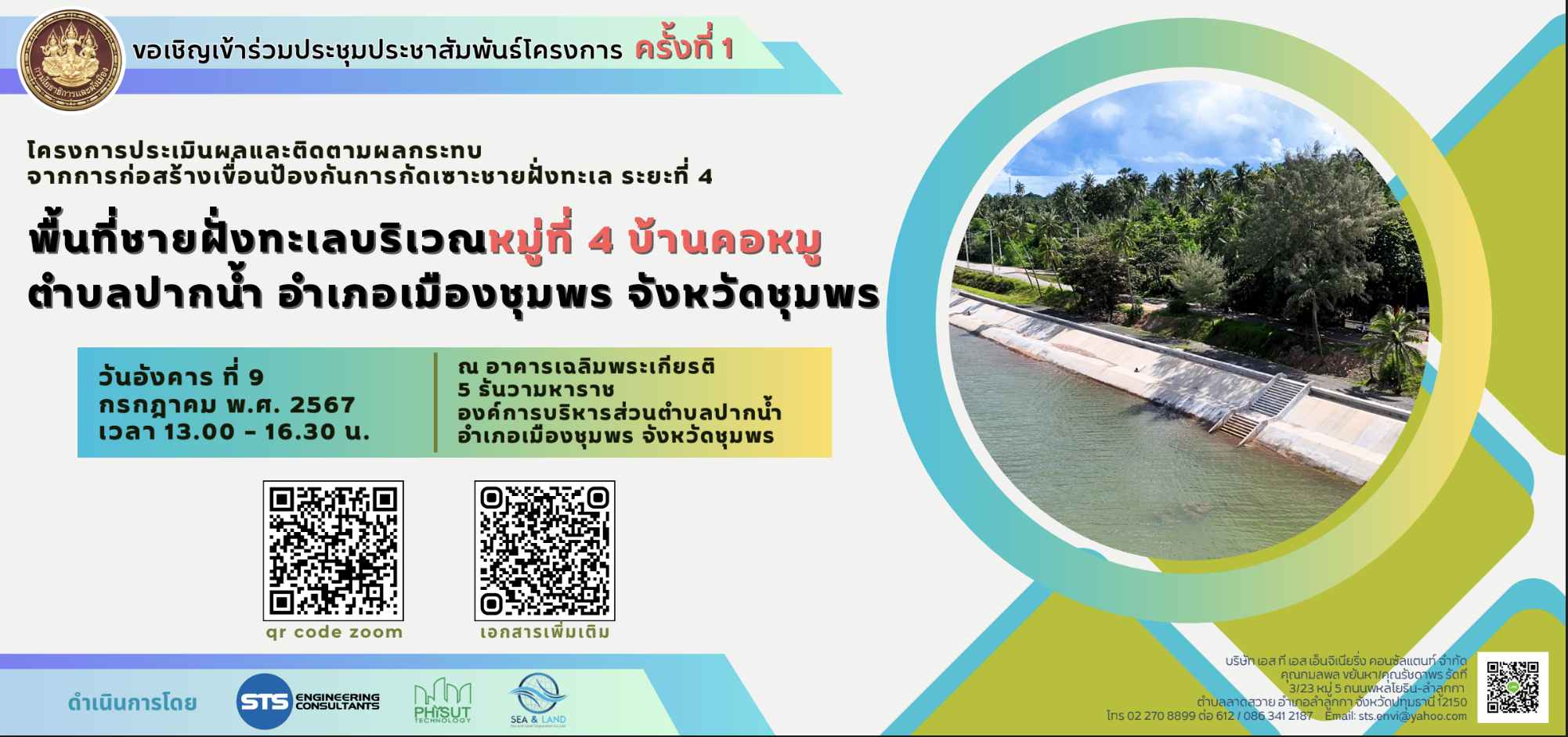 ขอเชิญเข้าร่วมประชุมประชาสัมพันธ์โครงการการประเมินผลและติดตามผลกระทบจากการก่อสร้างเขื่อนป้องกันการกัดเซาะชายฝั่งทะเล ระยะที่ 4 พื้นที่ชายฝั่งทะเลบริเวณตำบลอ่าวน้อย อำเภอเมืองประจวบคีรีขันธ์ จังหวัดประจวบคีรีขันธ์ ในวันพฤหัสบดีที่ 11 กรกฎาคม พ.ศ. 2567 เวลา 13.00 – 16.30 น. ณ ศาลาการเปรียญวัดอ่าวน้อย ตำบลอ่าวน้อย อำเภอเมืองประจวบคีรีขันธ์ จังหวัดประจวบคีรีขันธ์พร้อมระบบวิดีโอคอนเฟอเรนซ์ (Video Conference) ผ่านโปรแกรม Zoom Cloud Meeting