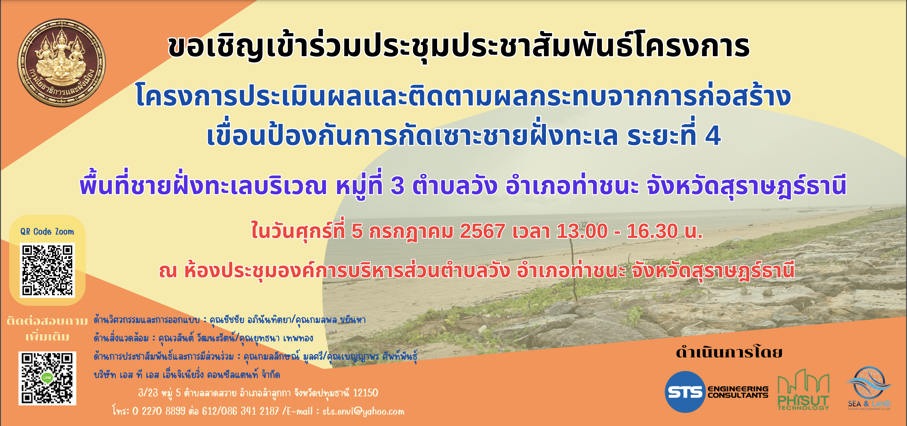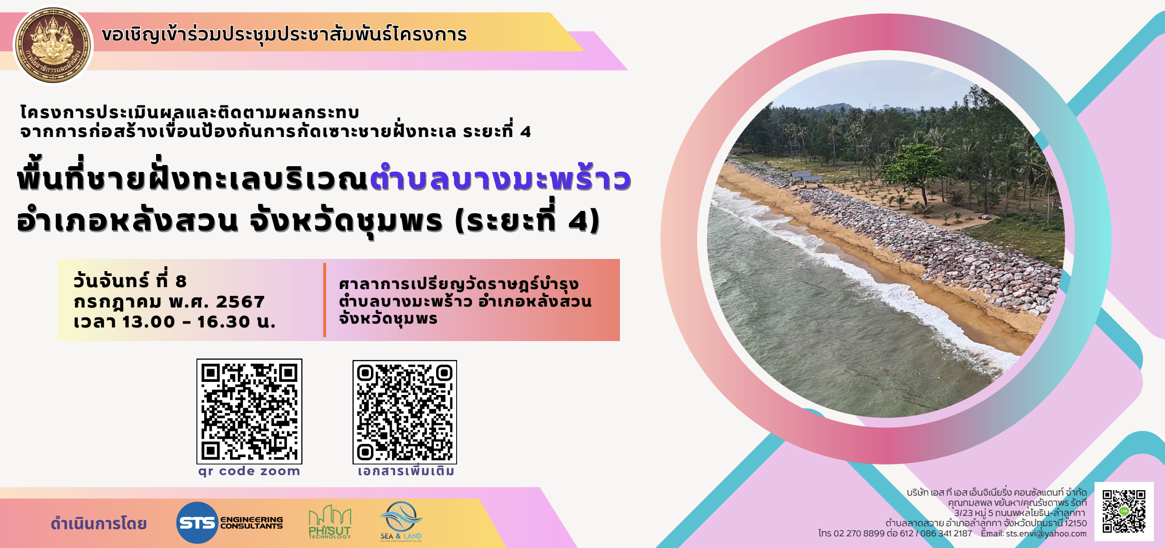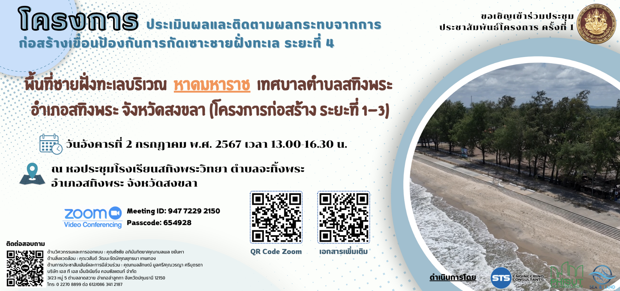 ขอเชิญเข้าร่วมประชุมประชาสัมพันธ์โครงการการประเมินผลและติดตามผลกระทบจากการก่อสร้างเขื่อนป้องกันการกัดเซาะชายฝั่งทะเล ระยะที่ 4 พื้นที่ชายฝั่งทะเลบริเวณตำบลอ่าวน้อย อำเภอเมืองประจวบคีรีขันธ์ จังหวัดประจวบคีรีขันธ์ ในวันพฤหัสบดีที่ 11 กรกฎาคม พ.ศ. 2567 เวลา 13.00 – 16.30 น. ณ ศาลาการเปรียญวัดอ่าวน้อย ตำบลอ่าวน้อย อำเภอเมืองประจวบคีรีขันธ์ จังหวัดประจวบคีรีขันธ์พร้อมระบบวิดีโอคอนเฟอเรนซ์ (Video Conference) ผ่านโปรแกรม Zoom Cloud Meeting