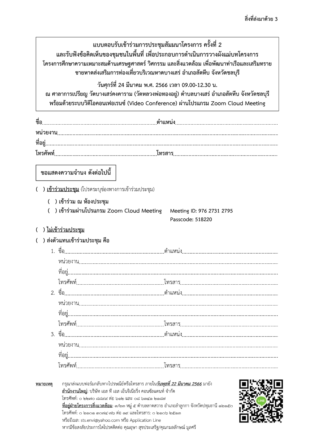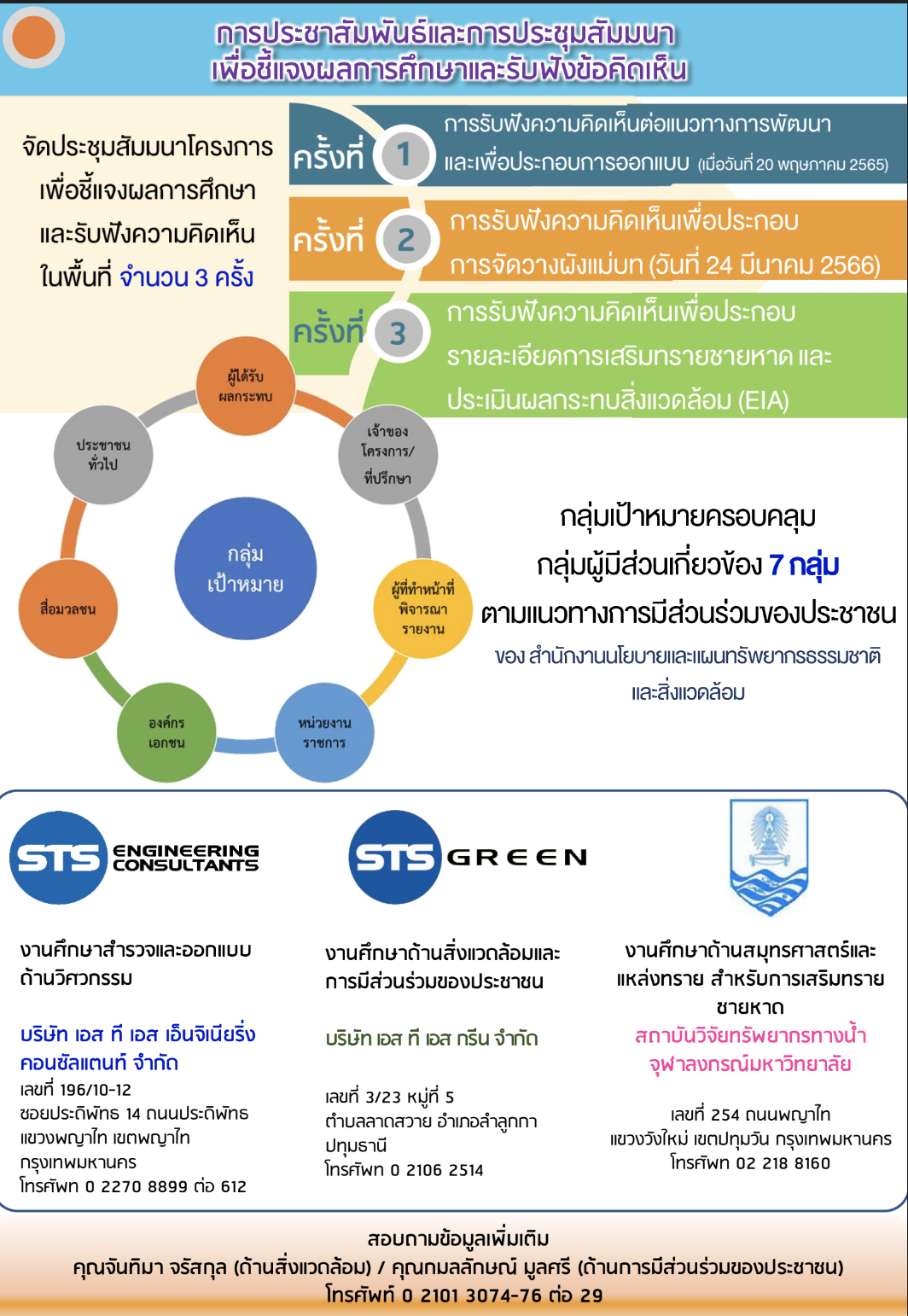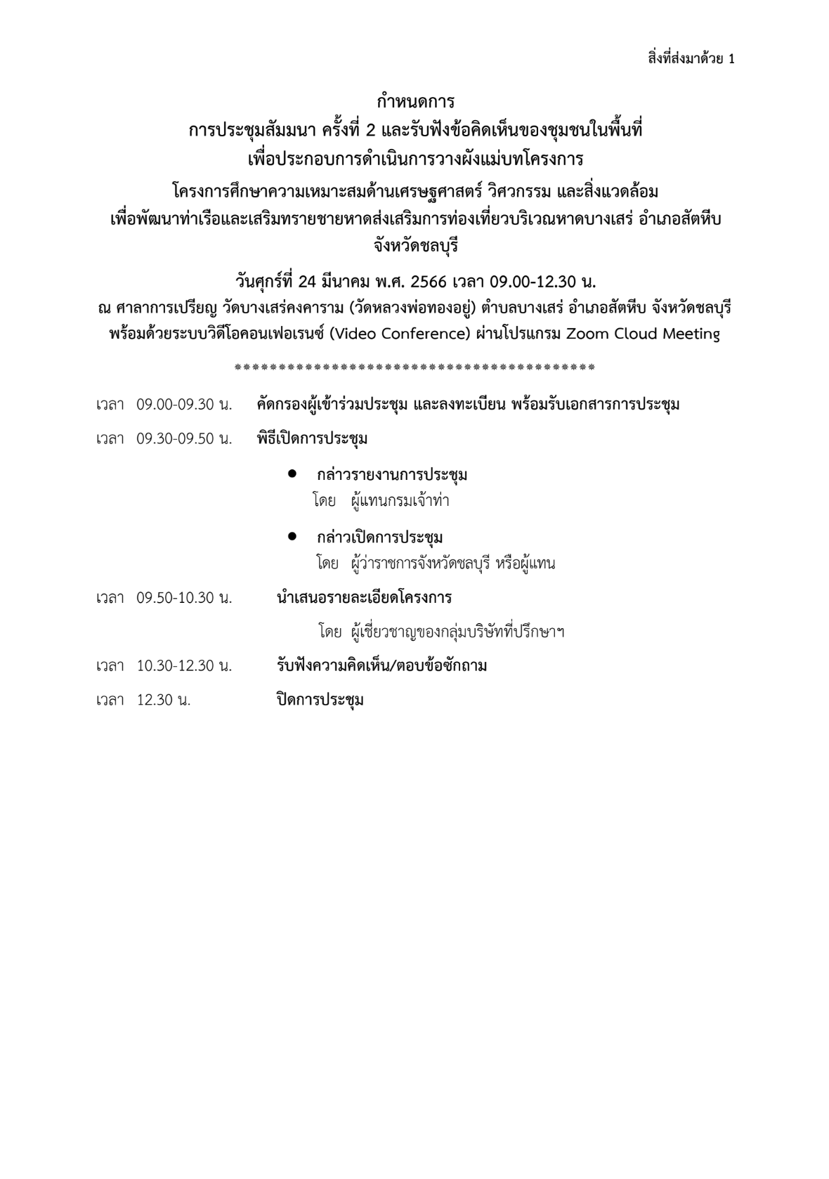 “โครงการศึกษาความเหมาะสมด้านเศรษฐศาสตร์ วิศกรรม และสิ่งแวดล้อม เพื่อพัฒนาท่าเรือและเสริมทรายชายหาดส่งเสริมการท่องเที่ยวบริเวณหาดบางเสร่ อำเภอสัตหีบ จังหวัดชลบุรี” ในวันศุกร์ที่ 24 มีนาคม พ.ศ. 2566 เวลา 09.00-12.30 น. ณ ศาลาการเปรียญ วัดบางเสร่คงคาราม (วัดหลวงพ่อทองอยู่) ตำบลบางเสร่ อำเภอสัตหีบ จังหวัดชลบุรี พร้อมด้วยระบบวิดีโอคอนเฟอเรนซ์ (Video Conference) ผ่านโปรแกรม Zoom Cloud Meeting