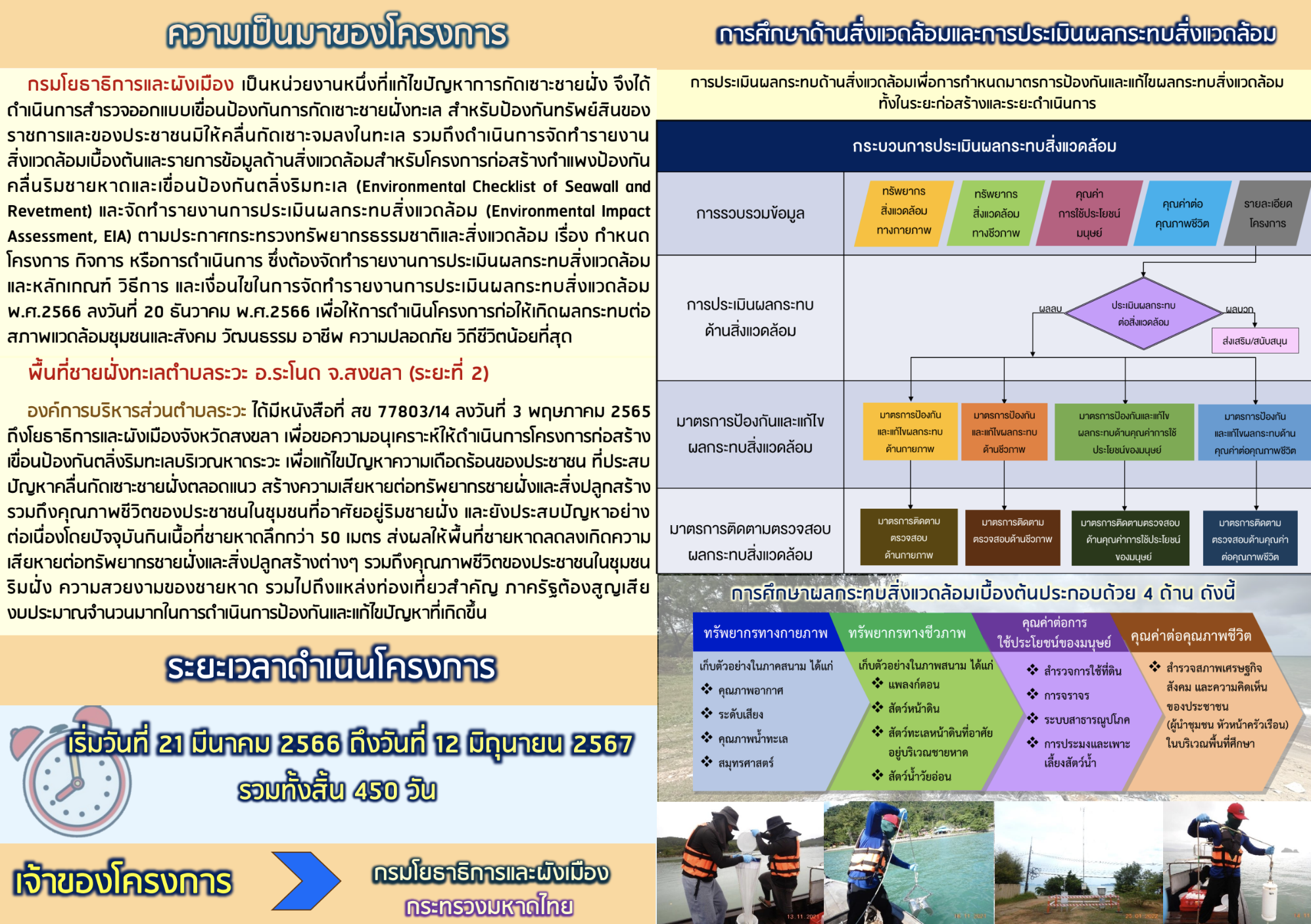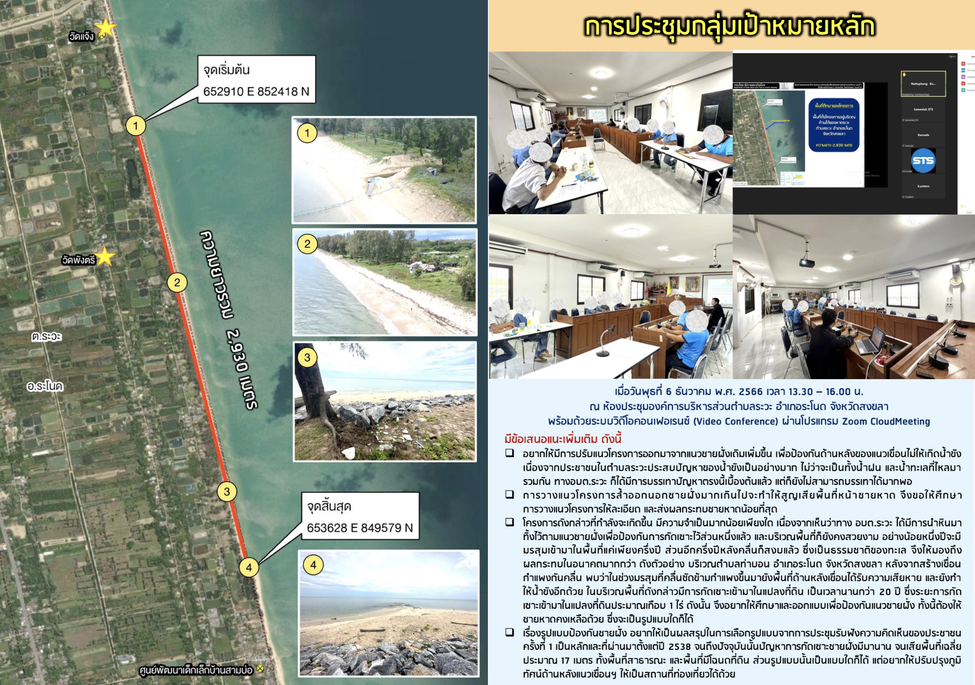 ขอเชิญเข้าร่วมประชุมรับฟังความคิดเห็น ครั้งที่ 1 โครงการออกแบบและศึกษาผลกระทบสิ่งแวดล้อมเขื่อนป้องกันการกัดเซาะชายฝั่งทะเล ระยะที่ 5 พื้นที่ชายฝั่งทะเลตำบลระวะ อำเภอระโนด จังหวัดสงขลา (ระยะที่ 2)พื้นที่ชายฝั่งทะเลบริเวณบ้านท้องโตนด ตำบลด่านสวี อำเภอสวี จังหวัดชุมพร ในวันพุธที่ 31 มกราคม 2567 เวลา 13.00-16.30 น. ณ ศาลาการเปรียญวัดพังตรี ตำบลระวะ อำเภอระโนด จังหวัดสงขลา พร้อมระบบวิดีโอคอนเฟอเรนซ์ (Video Conference) ผ่านโปรแกรม Zoom Cloud Meeting (Meeting ID: 916 4478 6793 Passcode: 812309)