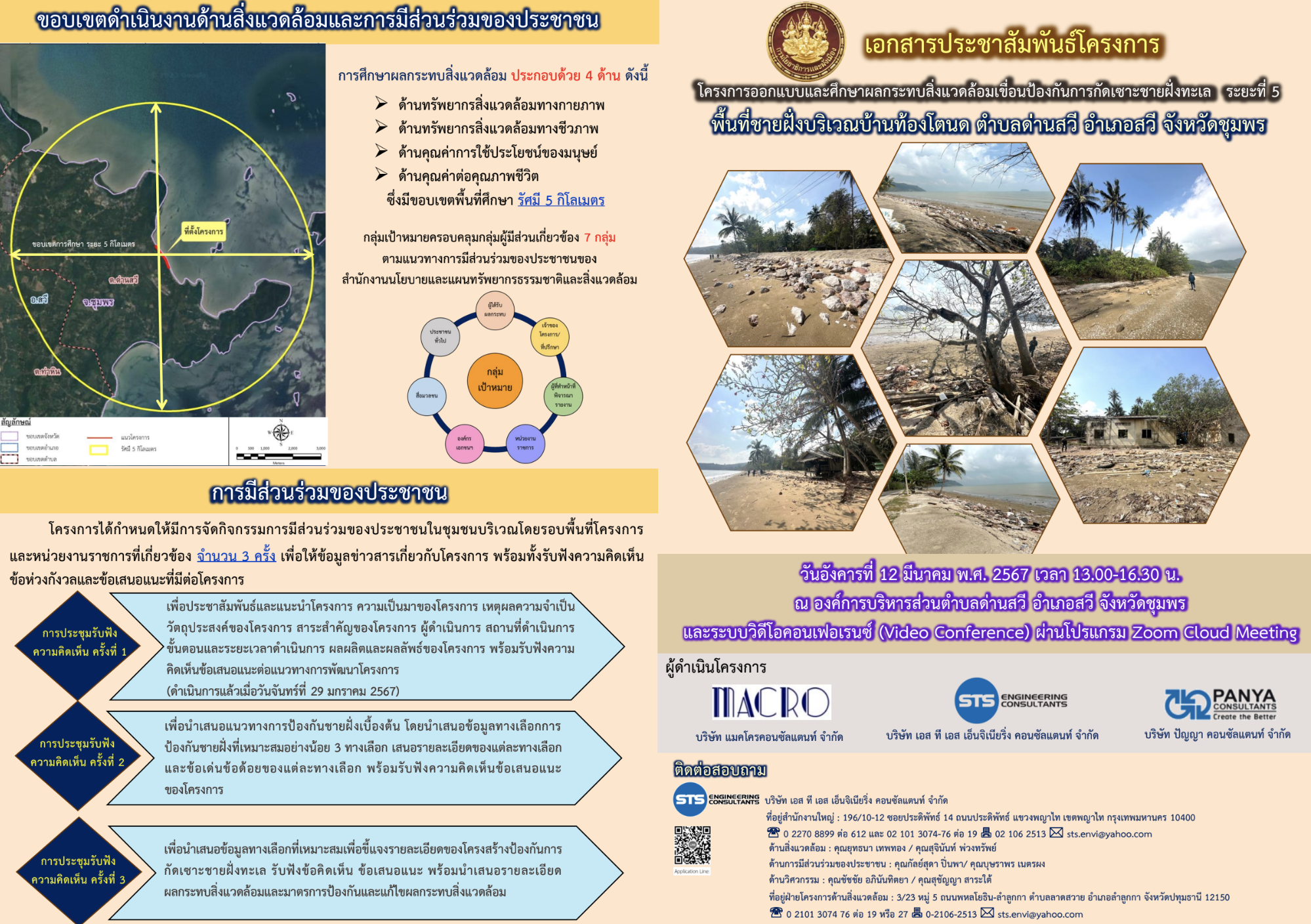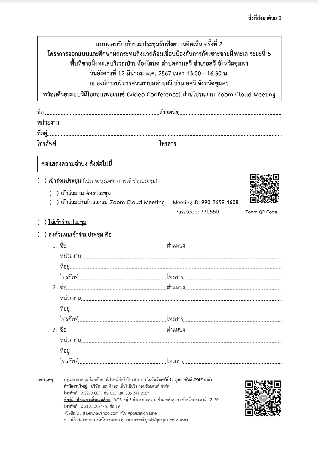 ในวันอังคารที่ 12 มีนาคม 2567 เวลา 13.00-16.30 น. ณ องค์การบริหารส่วนตำบลด่านสวี อำเภอสวี จังหวัดชุมพร พร้อมระบบวิดีโอคอนเฟอเรนซ์ (Video Conference) ผ่านโปรแกรม Zoom Cloud Meeting (Meeting ID: 990 2659 4608 Passcode: 770550)