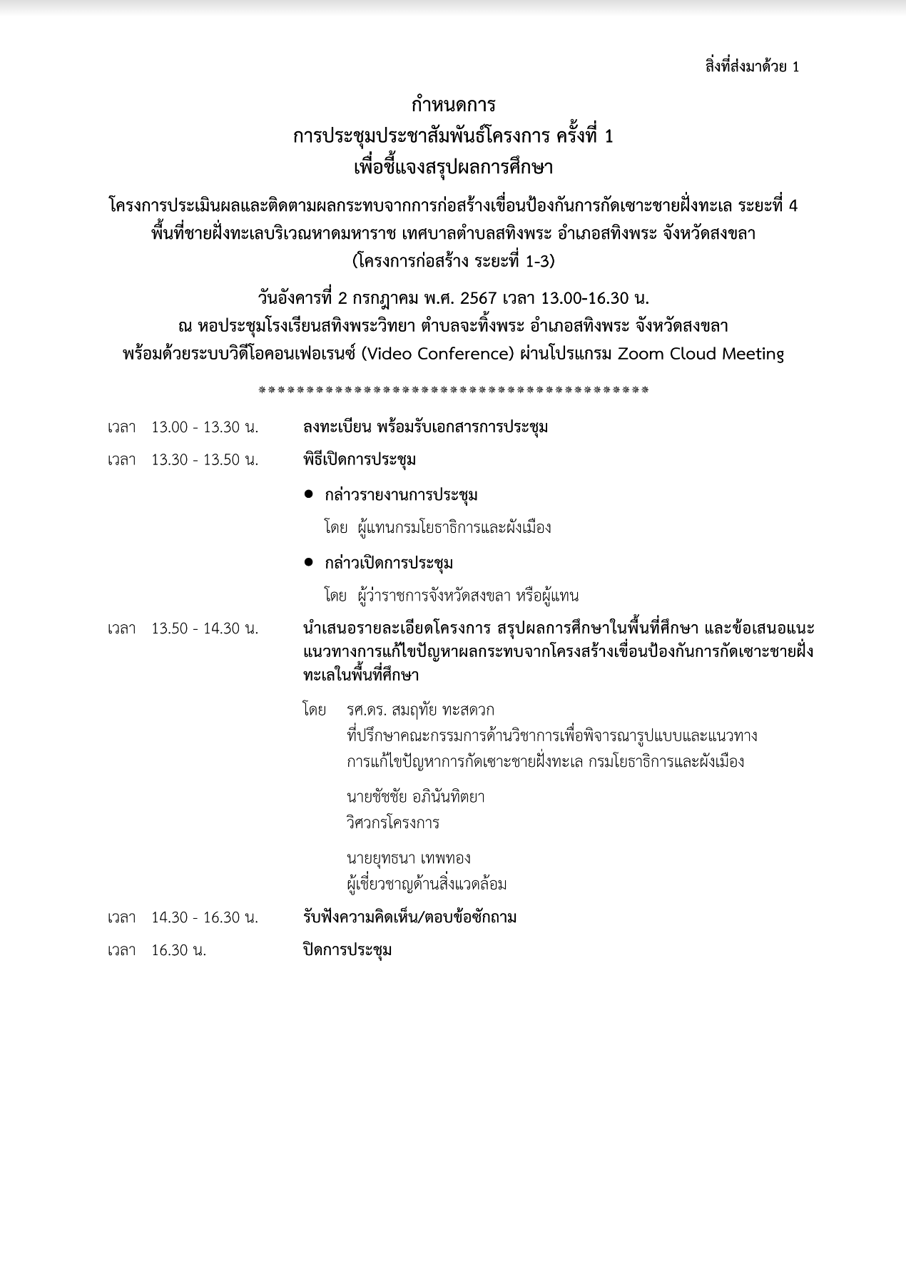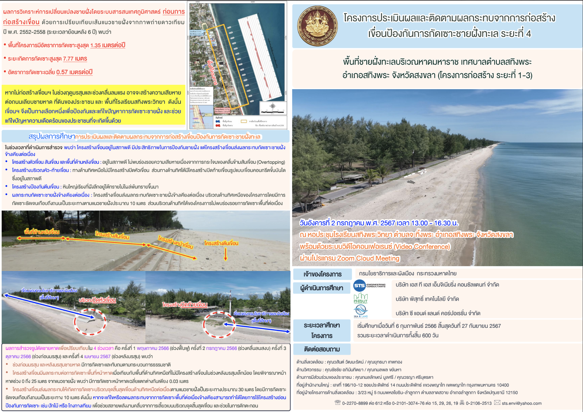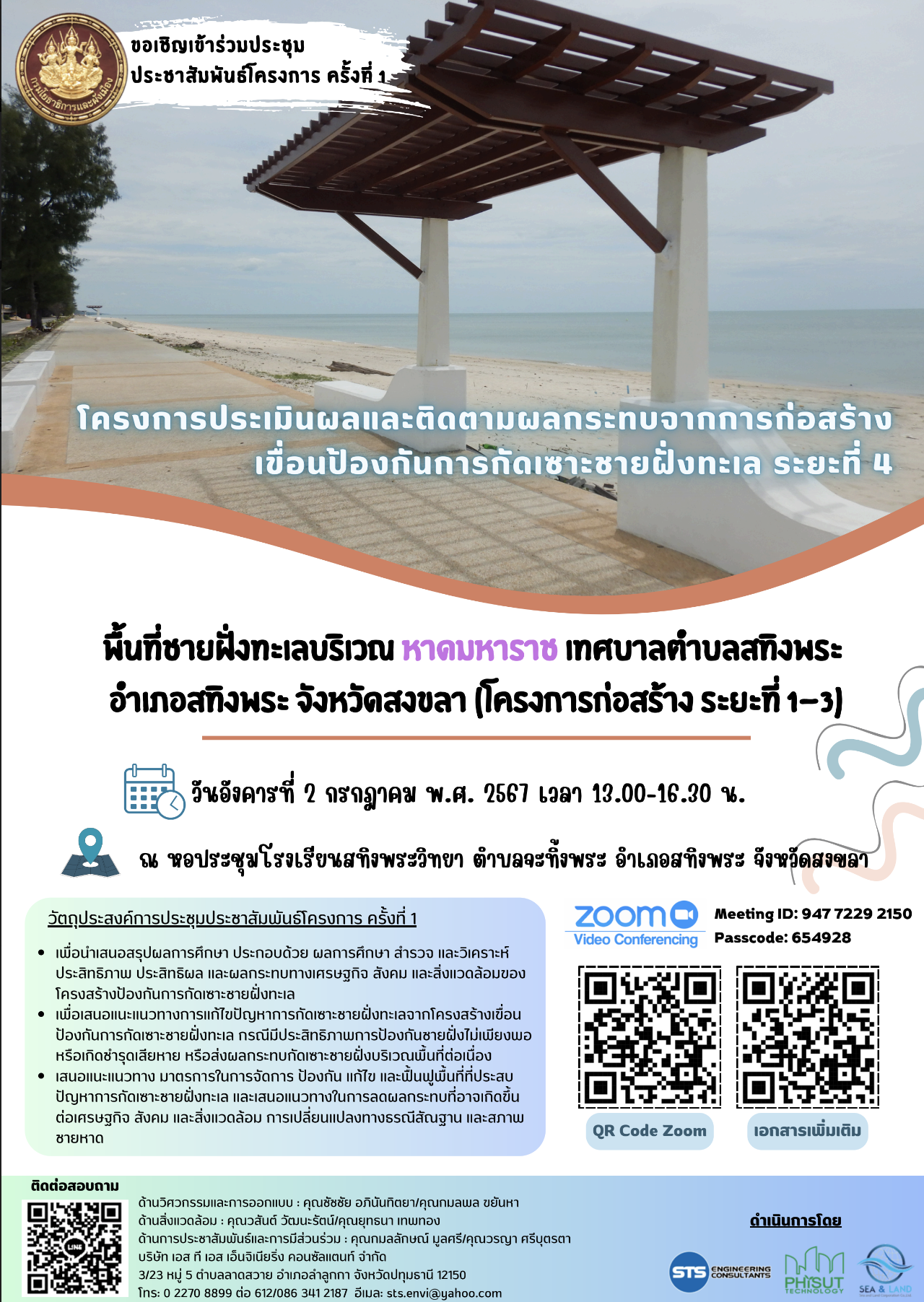 ขอเชิญเข้าร่วมประชุมรับฟังความคิดเห็น ครั้งที่ 1 โครงการประเมินผลและติดตามผลกระทบจากการก่อสร้างเขื่อนป้องกันการกัดเซาะชายฝั่งทะเล ระยะที่ 4 พื้นที่ชายฝั่งทะเลบริเวณหาดมหาราช เทศบาลตำบลสทิงพระ อำเภอสทิงพระ จังหวัดสงขลา (โครงการก่อสร้าง ระยะที่ 1-3) ในวันอังคารที่ 2 กรกฎาคม พ.ศ. 2567 เวลา 13.00 – 16.30 น. ณ หอประชุมรัตนโกสินทร์ ศูนย์ราชการอำเภอสทิงพระ จังหวัดสงขลา เปลี่ยนสถานที่จัดประชุมเป็น ณ หอประชุมโรงเรียนสทิงพระวิทยา ตำบลจะทิ้งพระ อำเภอสทิงพระ จังหวัดสงขลา พร้อมระบบวิดีโอคอนเฟอเรนซ์ (Video Conference) ผ่านโปรแกรม Zoom Cloud Meeting (Meeting ID: 947 7229 2150 Passcode: 654928)