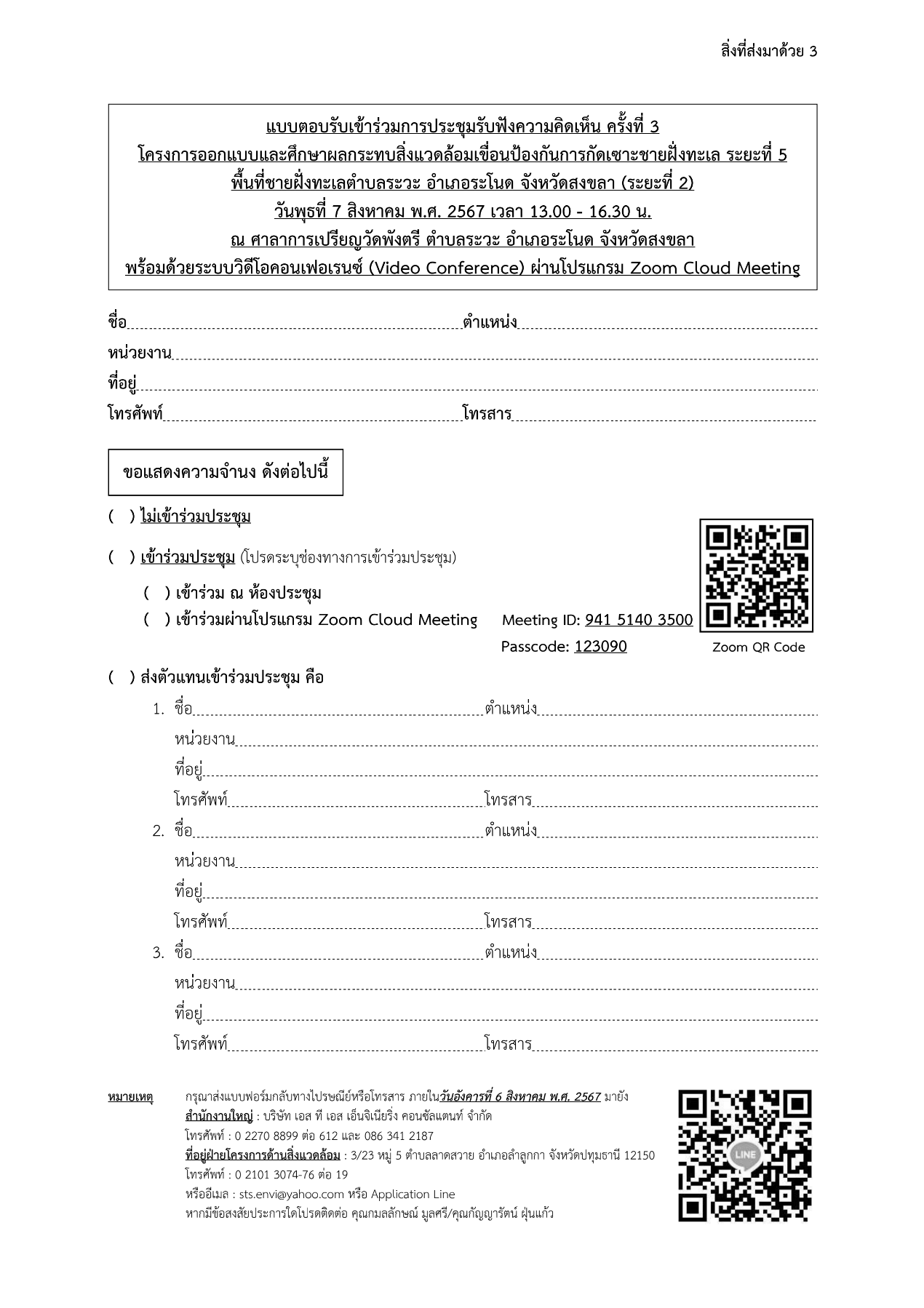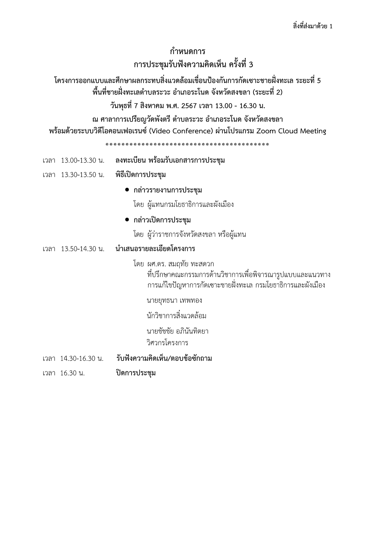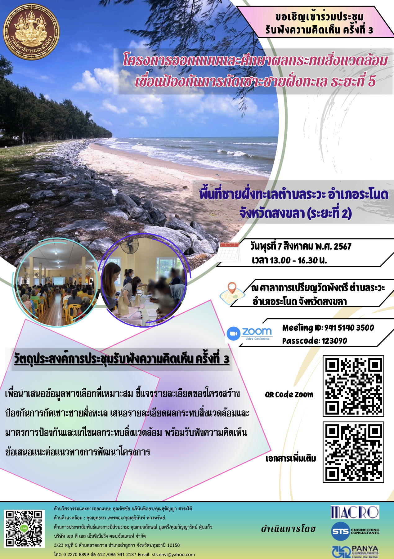ในวันพุธที่ 7 สิงหาคม พ.ศ. 2567 เวลา 13.00 - 16.30 น. ณ ศาลาการเปรียญวัดพังตรี ตำบลระวะ อำเภอระโนด จังหวัดสงขลา พร้อมระบบวิดีโอคอนเฟอเรนซ์ (Video Conference) ผ่านโปรแกรม Zoom Cloud Meeting (Meeting ID: 941 5140 3500 Passcode: 123090)