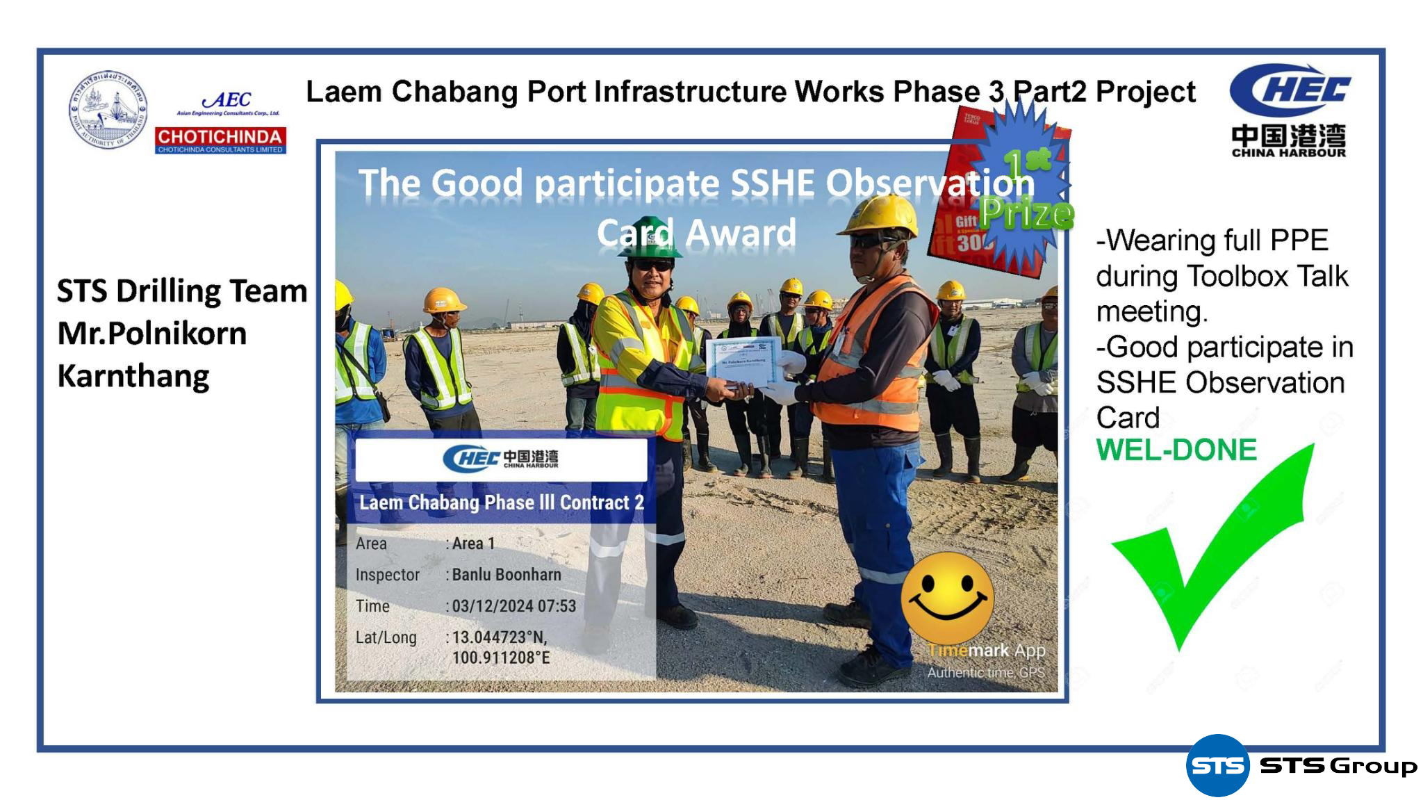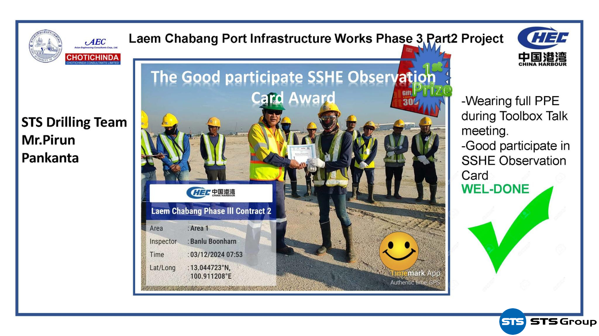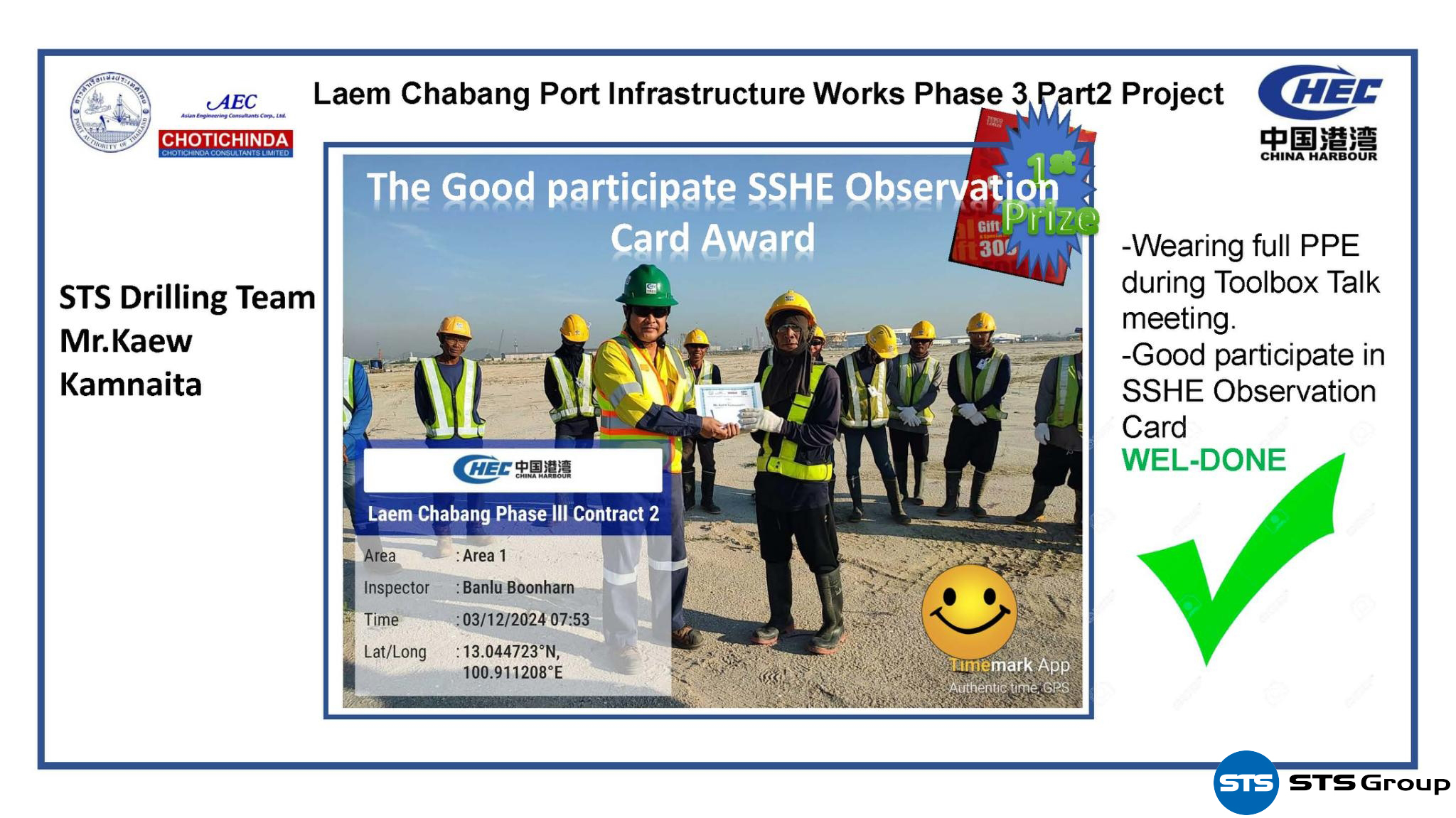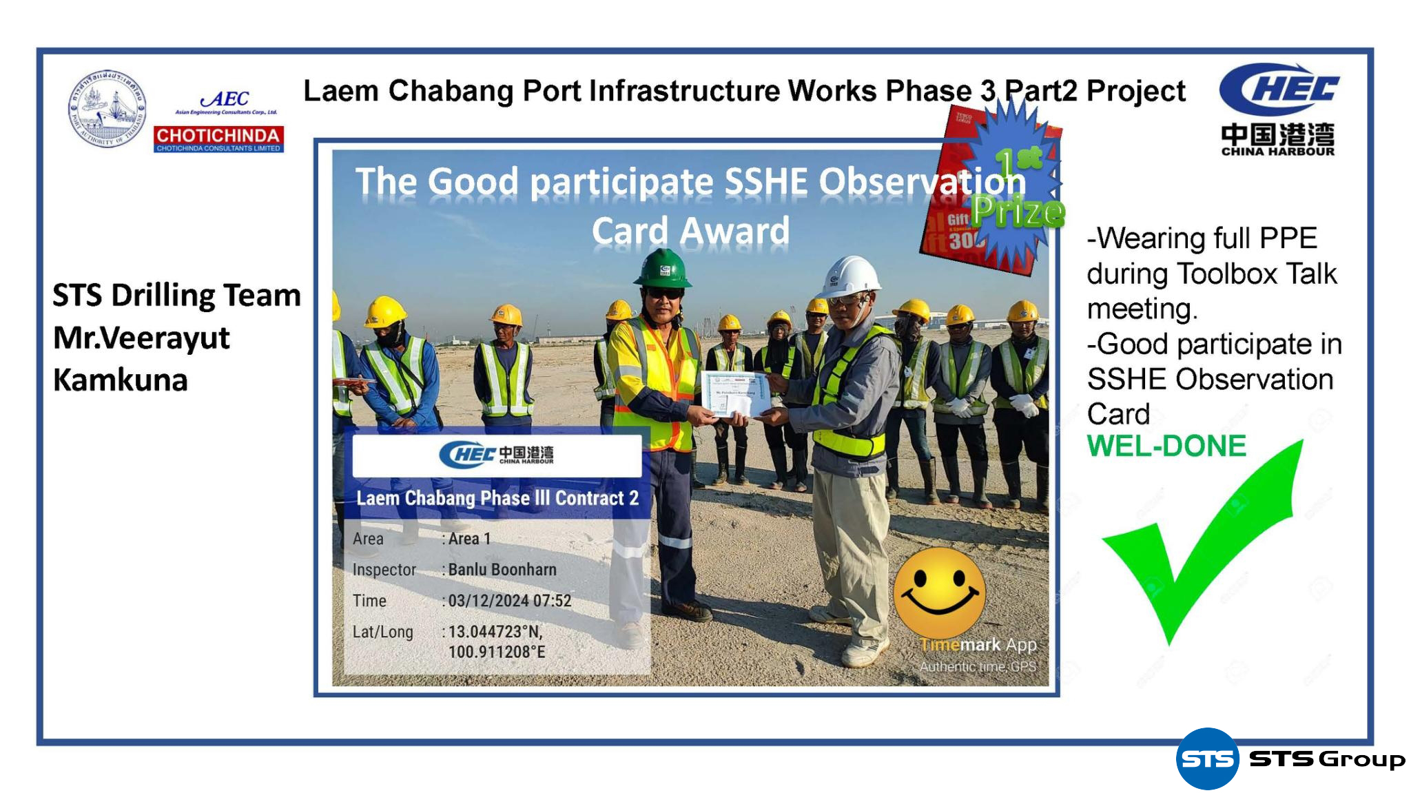 Geotechnical Services Business Unit บริษัท STS Group ได้รับรางวัลการมีส่วนร่วมใน SSHE ของโครงการพัฒนาท่าเรือแหลมฉบังระยะที่ 3 (ส่วนที่ 2) งานก่อสร้างอาคาร ท่าเทียบเรือ ระบบถนน และระบบสาธารณูปโภค จากการท่าเรือแห่งประเทศไทย/บริษัท ซีเอชอีซี (ไทย) จำกัด ซึ่งเป็นรางวัลที่มอบให้กับองค์กรที่มีความเป็นเลิศด้านความมั่นคงปลอดภัย การป้องกันด้านอาชีวอนามัย และรับผิดชอบต่อสิ่งแวดล้อมในที่ทำงาน
