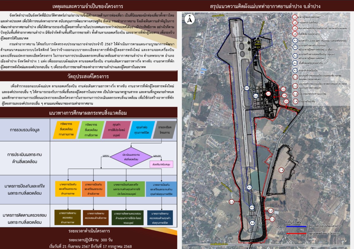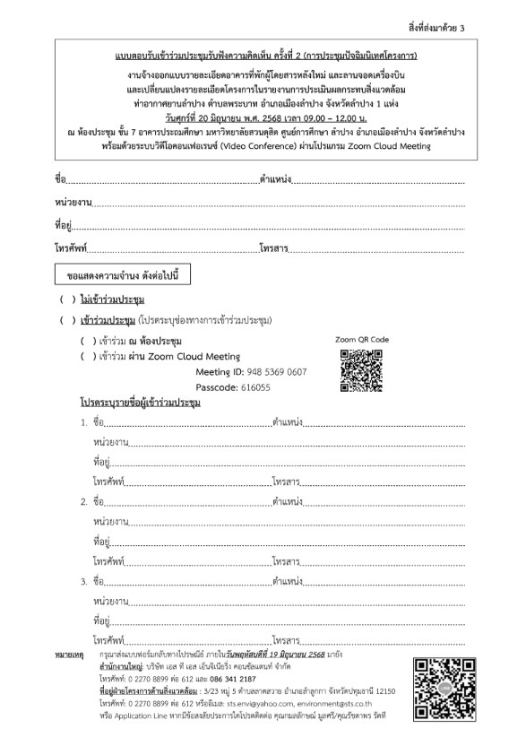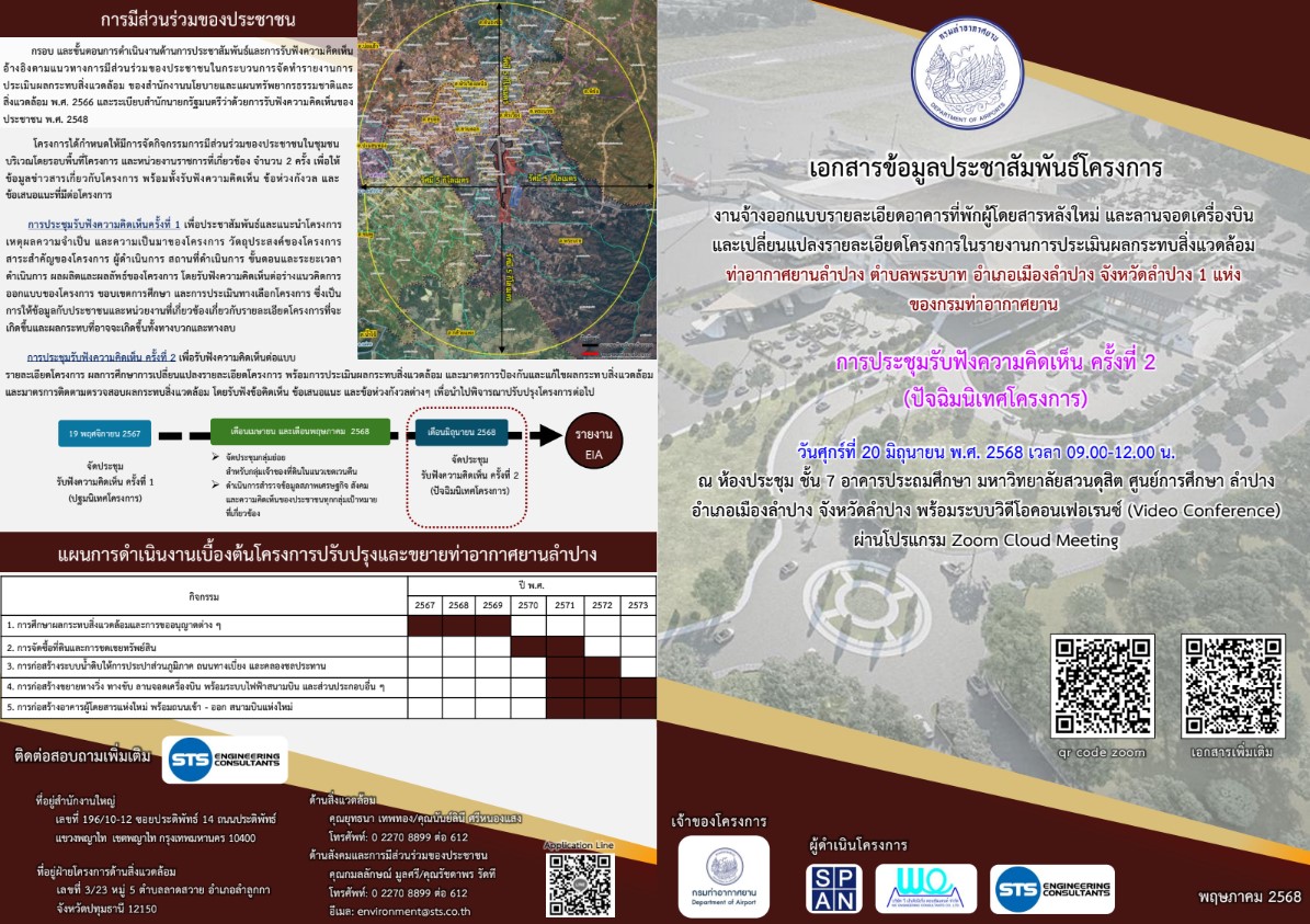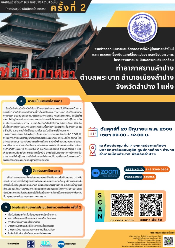 ขอเชิญเข้าร่วมประชุมรับฟังความคิดเห็น ครั้งที่ 2 (การประชุมปัจฉิมนิเทศโครงการ) งานจ้างออกแบบรายละเอียดอาคารที่พักผู้โดยสารหลังใหม่ และลานจอดเครื่องบิน และเปลี่ยนแปลงรายละเอียดโครงการในรายงานการประเมินผลกระทบสิ่งแวดล้อม ท่าอากาศยานลำปาง ตำบลพระบาท อำเภอเมืองลำปาง จังหวัดลำปาง 1 แห่ง ในวันศุกร์ที่ 20 มิถุนายน พ.ศ. 2568 เวลา 09.00-12.00 น. ณ ห้องประชุม ชั้น 7 อาคารประถมศึกษา มหาวิทยาลัยสวนดุสิต ศูนย์การศึกษา ลำปาง อำเภอเมืองลำปาง จังหวัดลำปาง พร้อมระบบวิดีโอคอนเฟอเรนซ์ (Video Conference) ผ่านโปรแกรม Zoom Cloud Meeting (Meeting ID: 948 5369 0607 Passcode: 616055)