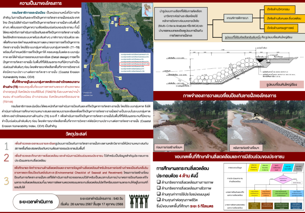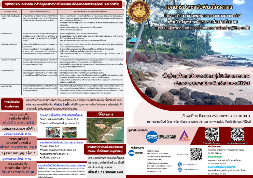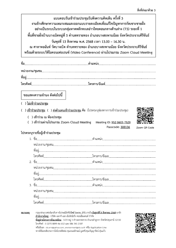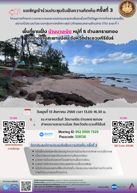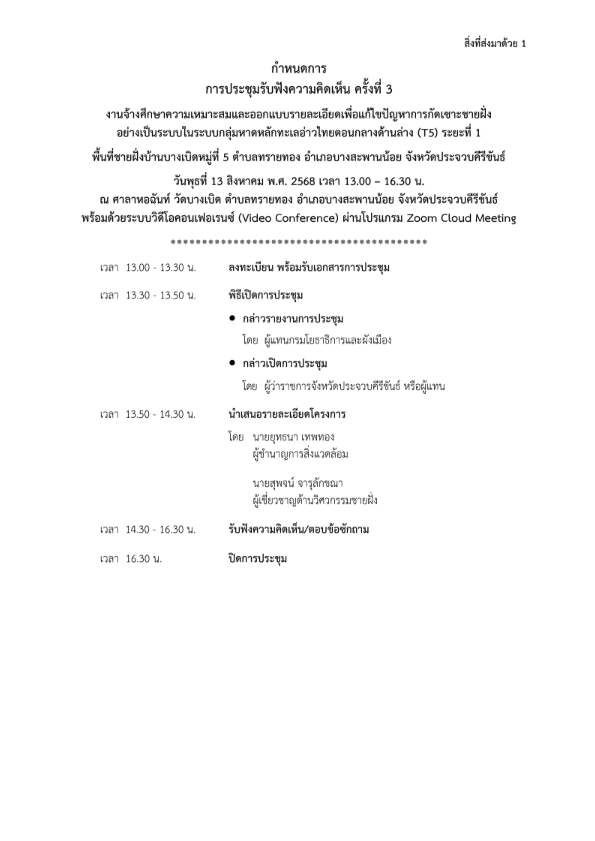พื้นที่ชายฝั่งบ้านบางเบิด หมู่ที่ 5 ตำบลทรายทอง อำเภอบางสะพานน้อย จังหวัดประจวบคีรีขันธ์ ในวันพุธที่ 13 สิงหาคม พ.ศ. 2568 เวลา 13.00 – 16.30 น. ณ ศาลาหอฉันท์ วัดบางเบิด ตำบลทรายทอง อำเภอบางสะพานน้อย จังหวัดประจวบคีรีขันธ์ พร้อมระบบวิดีโอคอนเฟอเรนซ์ (Video Conference) ผ่านโปรแกรม Zoom Cloud Meeting (Meeting ID: 952 0605 7529 Passcode: 308136)