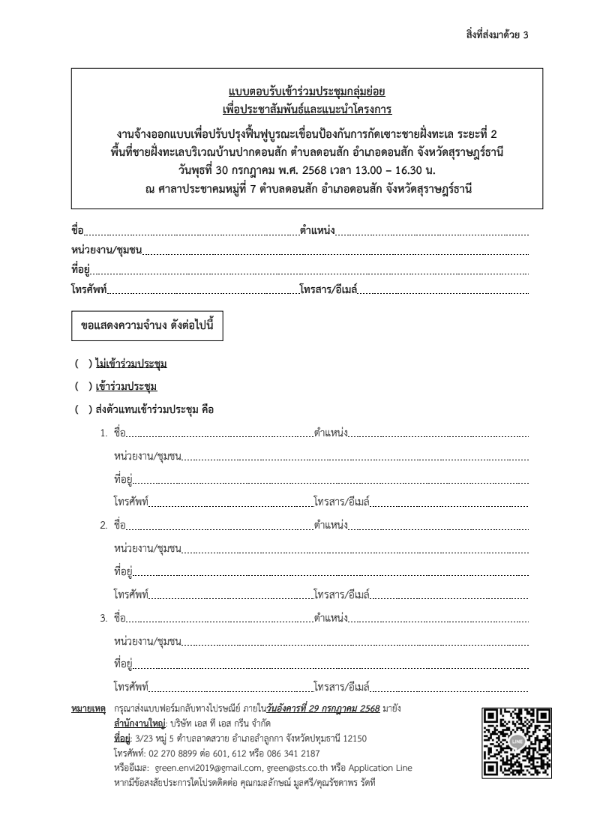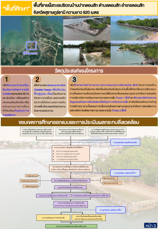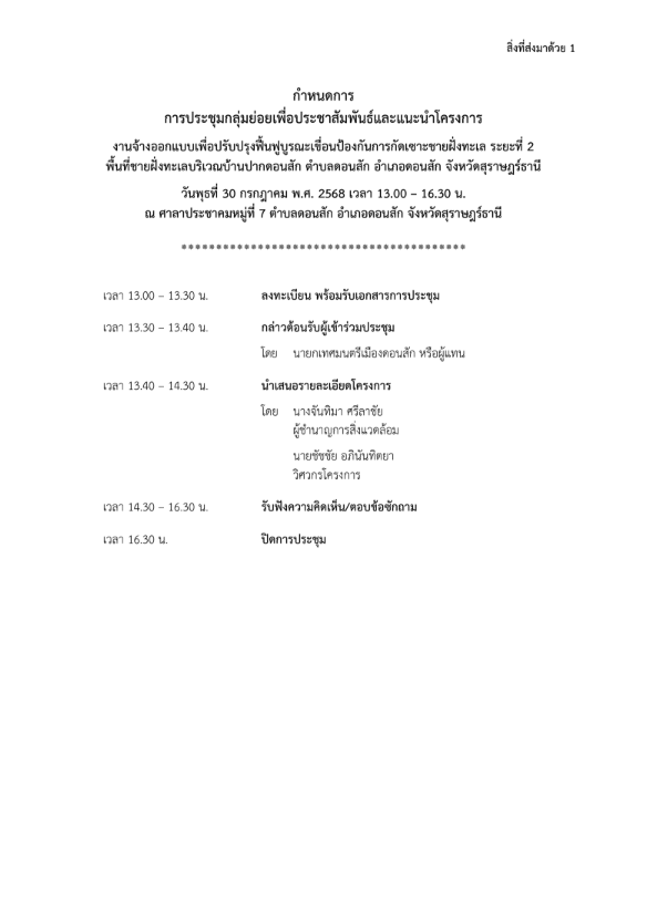 ขอเชิญเข้าร่วมประชุมกลุ่มย่อยเพื่อประชาสัมพันธ์และแนะนำโครงการงานจ้างออกแบบเพื่อปรับปรุงฟื้นฟูบูรณะเขื่อนป้องกันการกัดเซาะชายฝั่งทะเล ระยะที่ 2 พื้นที่ชายฝั่งทะเลบริเวณบ้านปากดอนสัก ตำบลดอนสัก อำเภอดอนสัก จังหวัดสุราษฎร์ธานี ในวันพุธที่ 30 กรกฎาคม พ.ศ. 2568 เวลา 13.00 – 16.30 น. ณ ศาลาประชาคมหมู่ที่ 7 ตำบลดอนสัก อำเภอดอนสัก จังหวัดสุราษฎร์ธานี