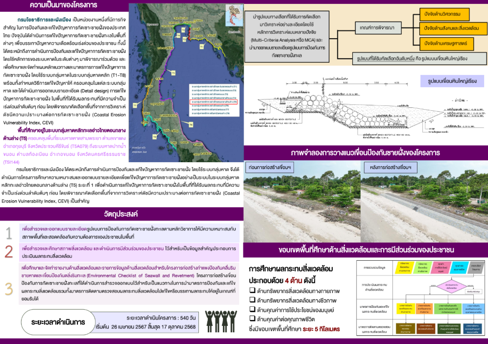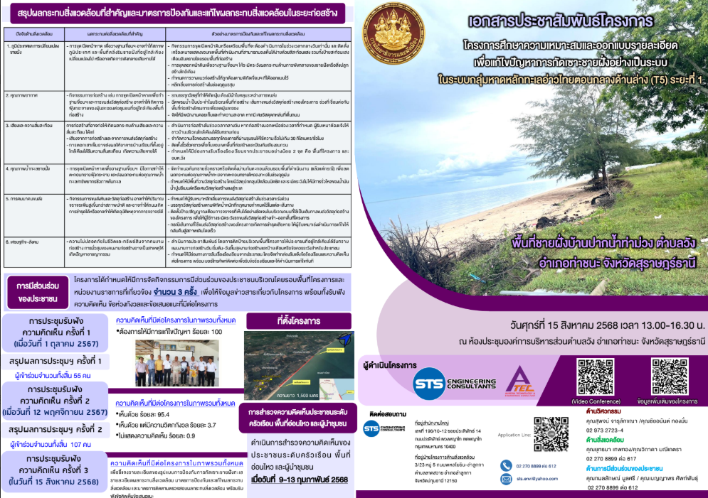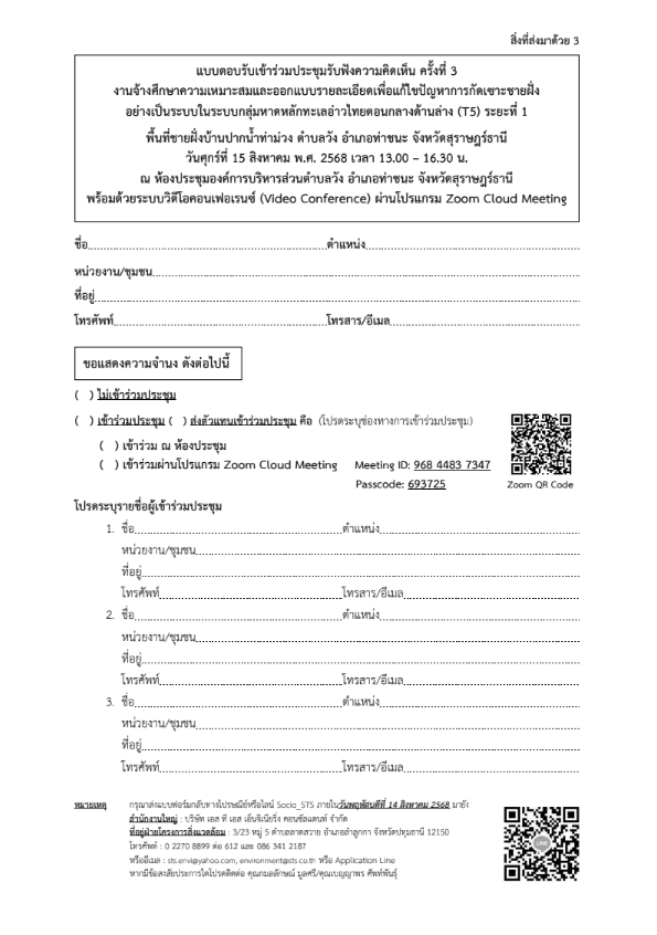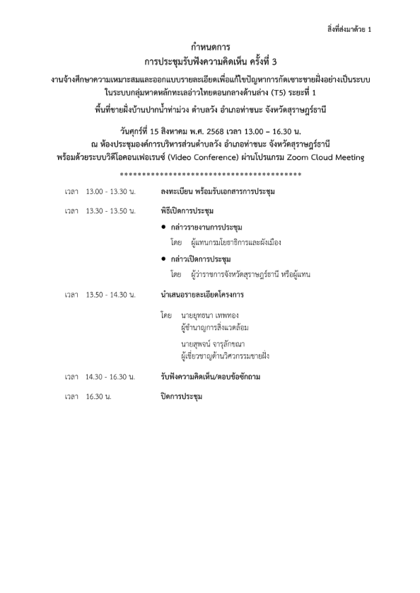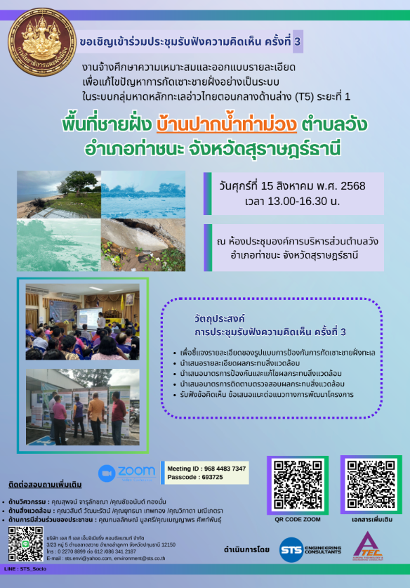ขอเชิญเข้าร่วมประชุมรับฟังความคิดเห็น ครั้งที่ 3 งานจ้างศึกษาความเหมาะสมและออกแบบรายละเอียดเพื่อแก้ไขปัญหาการกัดเซาะชายฝั่งอย่างเป็นระบบในระบบกลุ่มหาดหลักทะเลอ่าวไทยตอนกลางด้านล่าง (T5) ระยะที่ 1 พื้นที่ชายฝั่งบ้านปากน้ำท่าม่วง ตำบลวัง อำเภอท่าชนะ จังหวัดสุราษฎร์ธานี ในวันศุกร์ที่ 15 สิงหาคม พ.ศ. 2568 เวลา 13.00 – 16.30 น.ณ ห้องประชุมองค์การบริหารส่วนตำบลวัง อำเภอท่าชนะ จังหวัดสุราษฎร์ธานี พร้อมระบบวิดีโอคอนเฟอเรนซ์ (Video Conference) ผ่านโปรแกรม Zoom Cloud Meeting (Meeting ID: 968 4483 7347 Passcode: 693725)