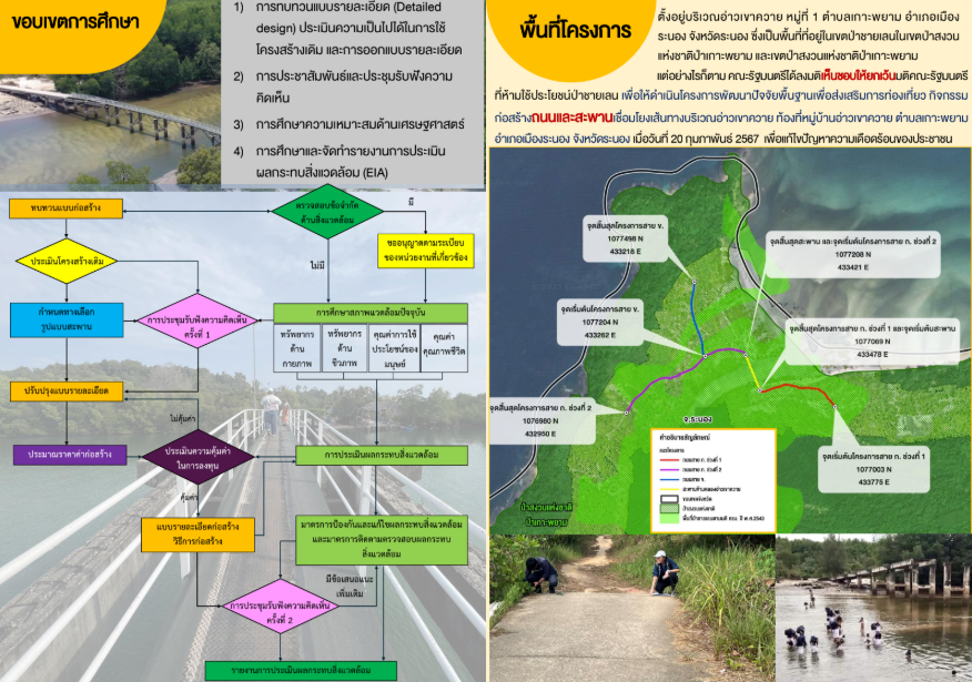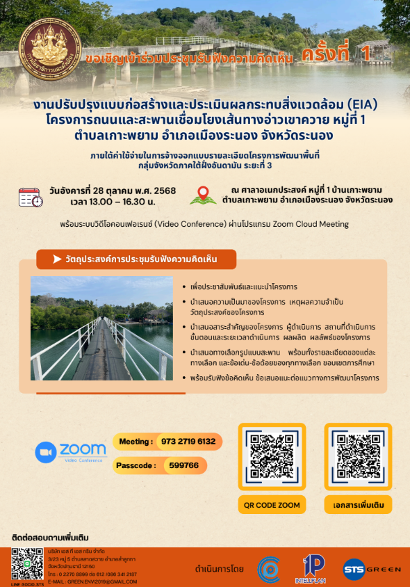ขอเชิญเข้าร่วมประชุมรับฟังความคิดเห็น ครั้งที่ 1 งานปรับปรุงแบบก่อสร้างและประเมินผลกระทบสิ่งแวดล้อม (EIA) โครงการถนนและสะพานเชื่อมโยงเส้นทางอ่าวเขาควาย หมู่ที่ 1 ตำบลเกาะพยาม อำเภอเมืองระนอง จังหวัดระนอง ภายใต้ค่าใช้จ่ายในการจ้างออกแบบรายละเอียดโครงการพัฒนาพื้นที่กลุ่มจังหวัดภาคใต้ฝั่งอันดามัน ระยะที่ 3 ในวันอังคารที่ 28 ตุลาคม พ.ศ. 2568 เวลา 13.00 – 16.30 น. ณ ศาลาอเนกประสงค์ หมู่ที่ 1 บ้านเกาะพยาม