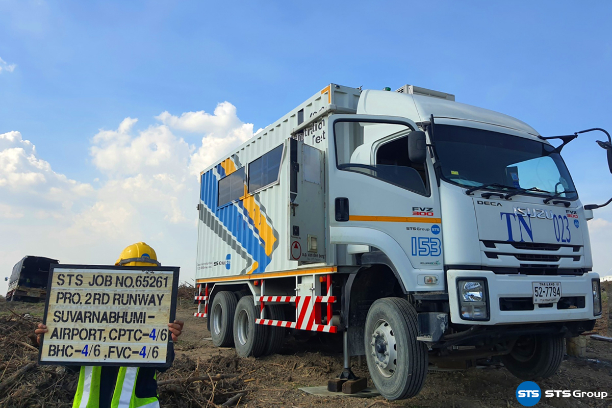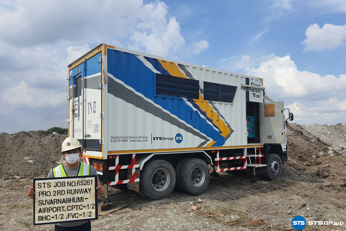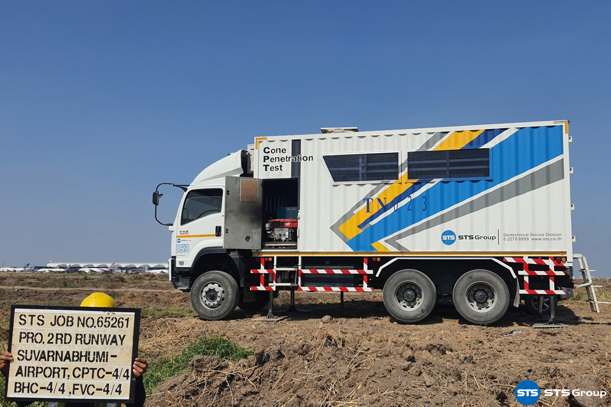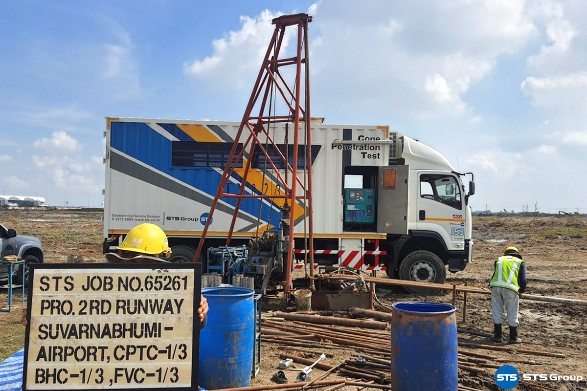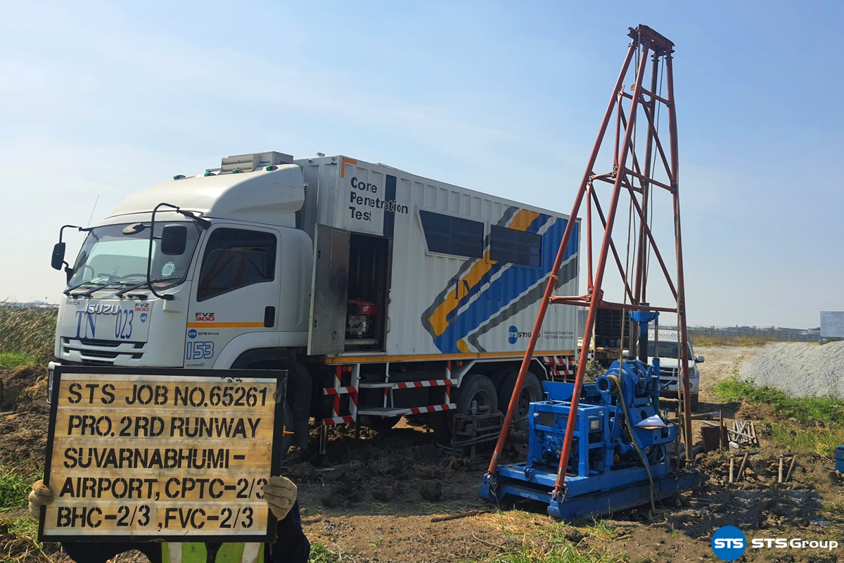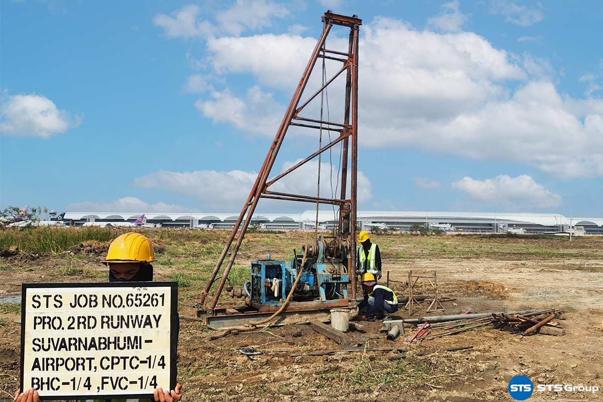 งานเจาะสำรวจและทดสอบคุณสมบัติของดิน งานทดสอบหาค่ากำลังรับแรงเฉือนแบบไม่ระบายน้ำ (Undrained Shear Strength) ในสนามด้วย Field Vane Shear Test และงานทดสอบการทะลุทะลวงของกรวยแบบวัดแรงดันน้ำ (Piezocone Penetration Test, CPTu) เพื่อเป็นข้อมูลสำหรับงานปรับปรุงคุณภาพดินด้วยวิธี Prefabricated Vertical Drain (PVD) บริเวณลานจอดอากาศยานประชิดอาคารเทียบเครื่องบินรอง หลังที่ 2