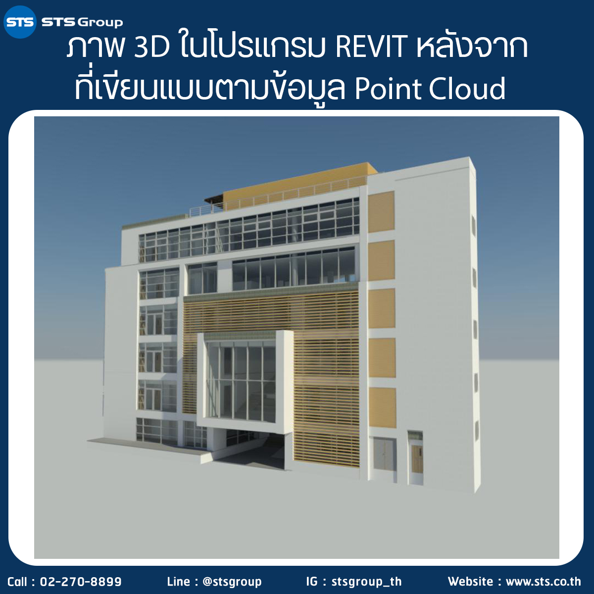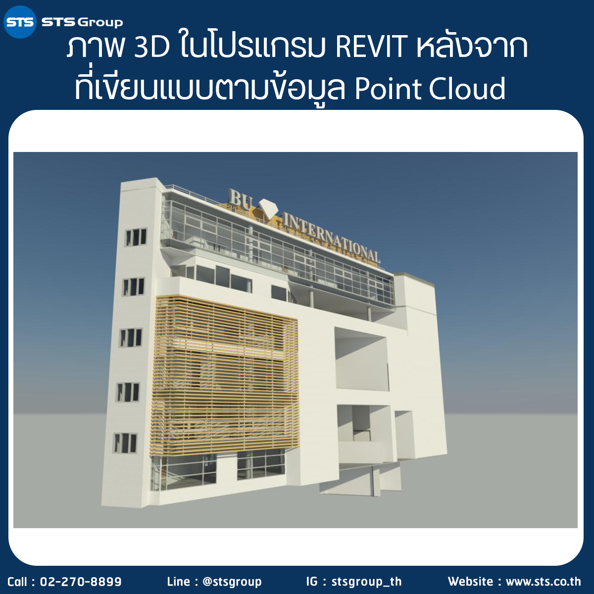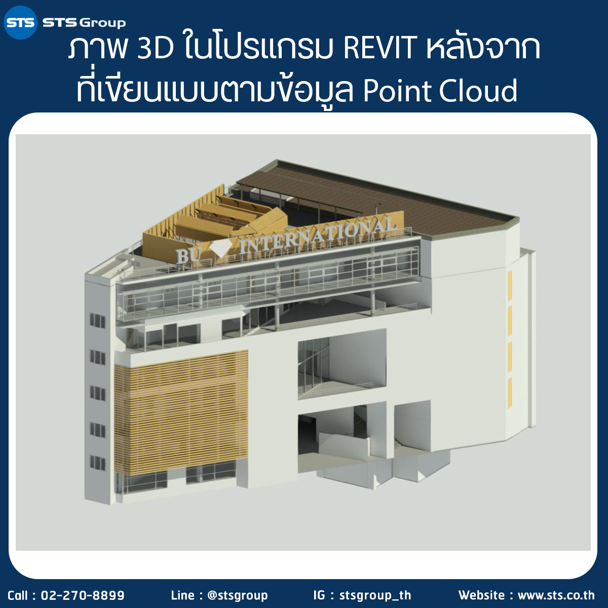 ข้อมูลหลังจากการประมวลผลและเขียนแบบจะอยู่ในรูปแบบ 3D Model และแบบ 2D Drawing โดยใช้โปรแกรม REVIT และข้อมูลในรูปแบบไฟล์อื่นๆ เช่น Autocad, pdf เป็นต้น Level of Development (LOD) ของงานอยู่ที่ LOD200 , LOD300 ฝ่าย : งานสำรวจจัดทำแผนที่ภูมิประเทศและงาน GIS เจ้าของโครงการ : มหาวิทยาลัยกรุงเทพ . สนใจสอบถามรายละเอียดบริการงาน 3D Laser Scanner ลูกค้าสามารถติดต่อได้ที่ช่องทางต่างๆ ต่อไปนี้ Line Official: @stsgroup 02-270-8899 Ext. 401,412,413,422 Fax. 02-279-8170 Email: survey@sts.co.th www.sts.co.th